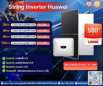 String Inverter on -grid system ใช้ Inverter ยี่ห้อ Huawei แผงโซล่าเซลล์ ยี่ห้อ Longi เริ่มต้นที่ขนาด 3 Kw ราคา